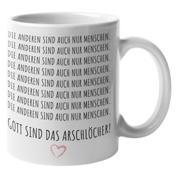 "Die anderen sind auch nur Menschen - Gott sind das Arschlöcher!" Lustiger Spruch: Unsere Jimbeels Kaffeetasse zaubert garantiert auch dem größten Morgenmuffel ein Lächeln auf die Lippen. Perfekt um den tristen Büroalltag aufzupeppen und um mit den Kollegen zu witzeln. Die Tasse für alle...- 16,95 €