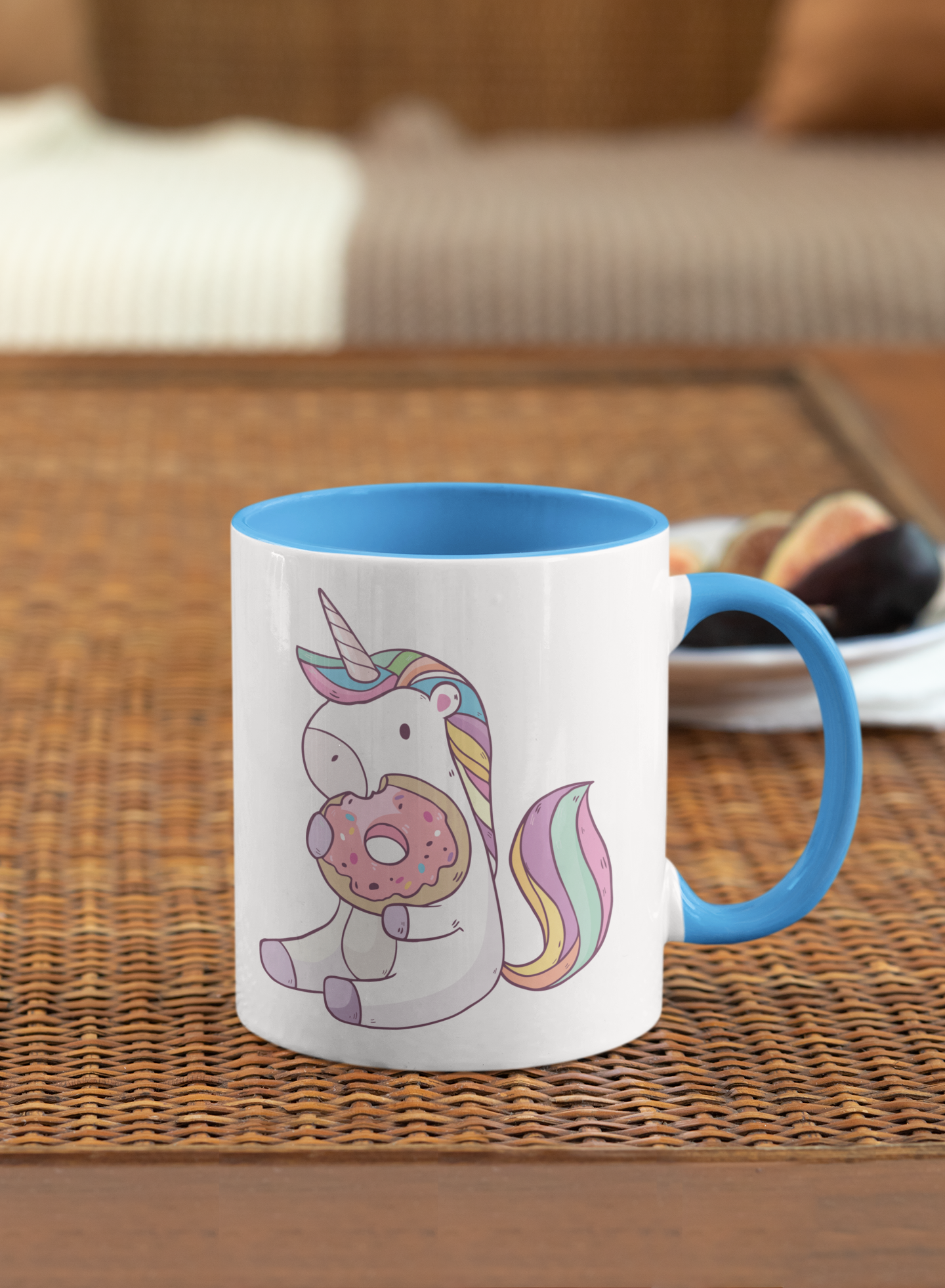 Bild einer Einhorn isst Donut | Tasse mit farbiger Innenseite