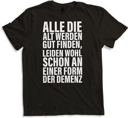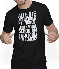Genieße Deine individualistische Seite mit diesem einmaligen Unisex T-Shirt, welches mit dem humorvollen Spruch "Alle, die alt werden gut finden, leiden wohl schon an einer Form der Demenz" punktet. Ein perfekter Eisbrecher für humorvolle Gespräche und ein ideales Geschenk für Deine Lieben, die den...- 24,95 €