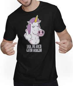 Jaja, Du auch guten Morgen Morgenmuffel Mittelfinger EinhornErlebe die Faszination des Andersseins mit diesem humorvollen Unisex T-Shirt. Perfekt für Nachtschwärmer, Spaßmacher und alle, die sich lieber noch einmal im Bett umdrehen. Der unglaubliche Aufdruck zeigt ein Einhorn, welches seinen Missmut an Morgenmenschen durch einen ausgestreckten Mittelfinger zum Ausdruck bringt. Schau Dich...- 24,95 €