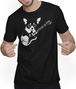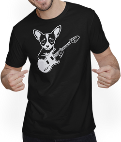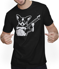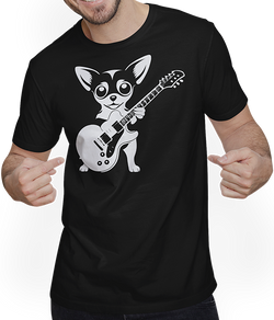 Lass Dich von einem amüsanten und von Chihuahuas inspirierten Unisex T-Shirt begeistern. Dieses in schwarz-weiß gestaltete Motiv bringt einen Chihuahua mit langem Fell, einen glattfelligen Chihuahua und einen Hirschgesicht-Chihuahua als Musiker zur Geltung. Künstlerisch entworfen von Jimbeels. Gestalte Deinen Alltagslook mit diesem Chihuahua-Gitarristenkunstwerk neu....- $30.00