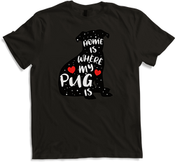 Mit diesem einzigartigen Shirt machst Du allen Hundeliebhabern eine besondere Freude. "Zuhause ist da, wo mein Mops ist!" - dieser charmante Spruch, umrahmt von zwei Herzen, ziert das Unisex T-Shirt und stellt eine extravagante Geschenkidee dar, unabhängig vom Geschlecht. Falls Du selbst keinen Mops...- $30.00