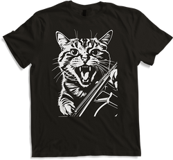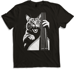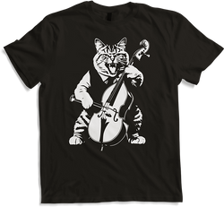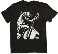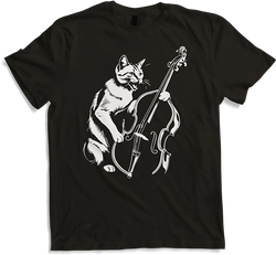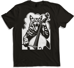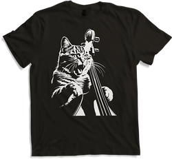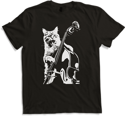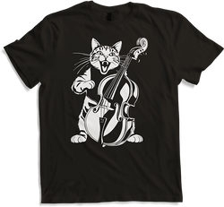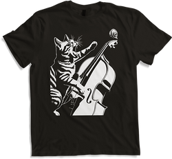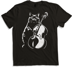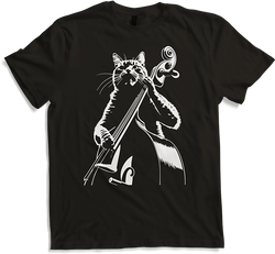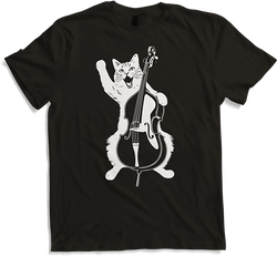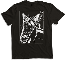 Liebst Du es, Deine Begeisterung für Katzen und Musik zur Schau zu stellen? Du wirst dieses originelle Unisex T-Shirt von Jimbeels lieben, das eine katzenartige Musikantin in schwarz-weiß, virtuos am Kontrabass, abbildet - die ideale Wahl für Freunde der Siamesen, Ragdolls oder Maine Coons!...- $30.00
