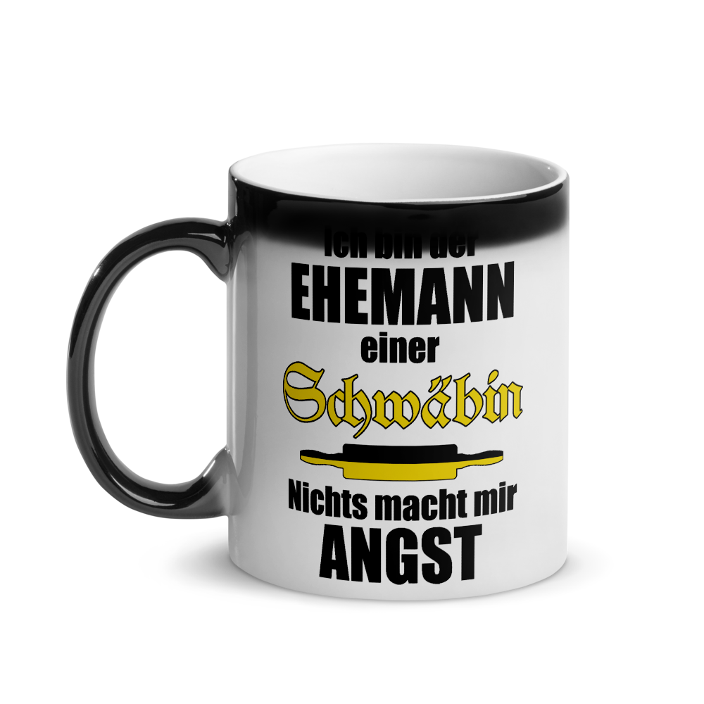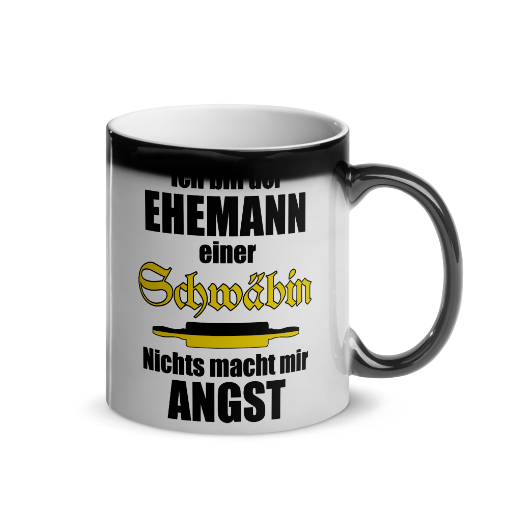 Der lustige Sprüche Becher für alle Ehemänner einer Schwäbin. Nicht nur um Stuttgart und Ludwigsburg herum wird dieser Spruch verstanden. Auch der so vermählte Bayer, Franke, Sachse u.a. können hier zeigen, was daheim auf sie wartet.