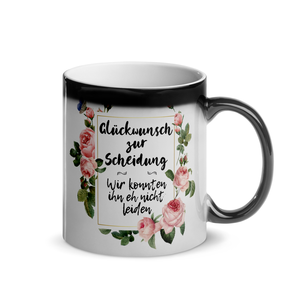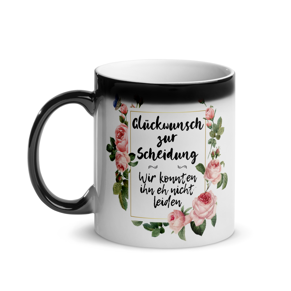 Auf dieser lustigen Kaffeetasse, für alle die gerade frisch geschieden sind, steht der witzige Spruch: "Glückwunsch zur Scheidung - Wir konnten ihn eh nicht leiden. " Das macht den Kaffeebecher zum perfekten Geschenk für alle geschiedenen Frauen über dessen ehemaligen Ehemann Du ohnehin Deine Meinung hattest.